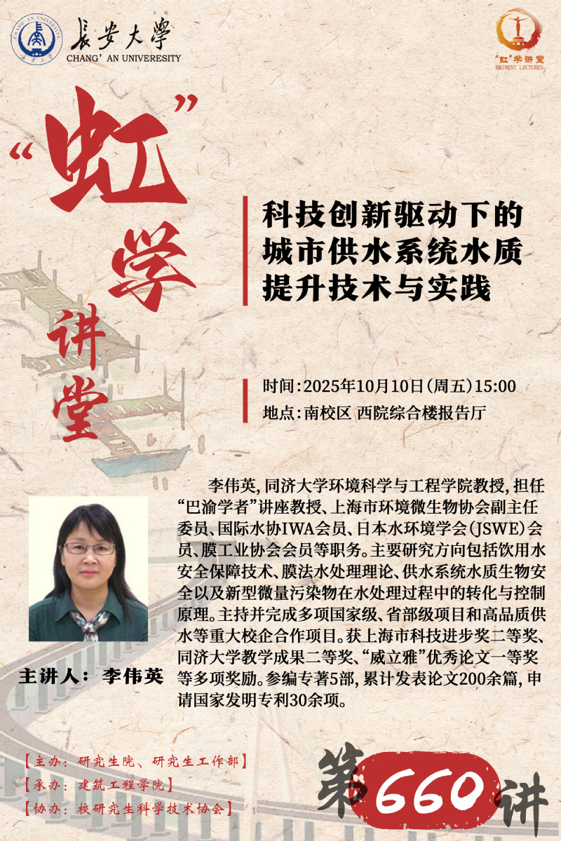 李伟英,同济大学环境科学与工程学院教授,担任“巴渝学者”讲座教授、上海市环境微生物协会副主任委员、国际水协IWA会员、日本水环境学会(ISWE)会员、膜工业协会会员等职务。主要研究方向包括饮用水安全保障技术、膜法水处理理论、供水系统水质生物安全以及新型微量污染物在水处理过程中的转化与控制原理。主持并完成多项国家级、省部级项日和高品质供水等重大校企合作项目。获上海市科技进步奖二等奖、同济大学教学成果二等奖、“威立雅”优秀论文一等奖等多项奖励。参编专著5部,累计发表论文200余篇,申请国家发明专利30余项。