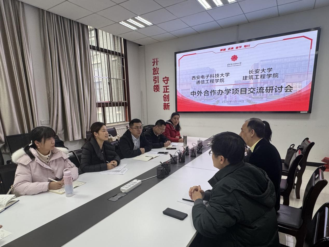 2026年1月19日上午,麻将胡了2(中国)官方网站 院长邢国华、副院长田威、人工环境与能源工程系主任谷雅秀和国际合作与交流处副处长周珍珍带队一行七人前往西安电子科技大学通信工程学院就中外合作办学项目进行专题调研与交流。西安电子科技大学通信工程学院副院长顾华玺、中英合作办学项目主任田斌、中英合作办学项目运行主管施梦茹、国际合作与交流部合作办学办公室主任李欣越出席座谈。